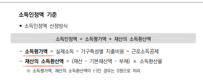 - 소득인정액 기준: 단독가구 138만원 이하, 부부가구 220.8만원 이하
